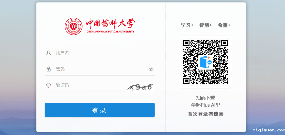 一、输入用户名:学号,密码:身份证号码后6位,验证码登录中国药科大学继续教育学院网络教务管理平台http://manager.zgyk.sccchina.net/。(注:忘记密码可在“学起plus”首页重置或联系管理老师重置。)